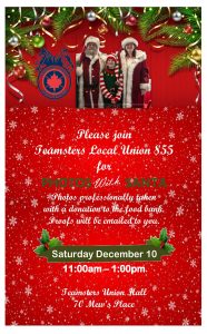 On Saturday, December 10th, 2022 from 11am to 1 pm, drop by Teamsters Union Local 855 located at 70 Mews Place, St. John’s for your photo with the big man himself – Mr. Claus!