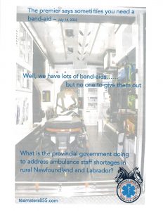 Teamsters Union Local 855 is calling on the Provincial government to take immediate action on ambulance staff shortages in rural Newfoundland and Labrador.